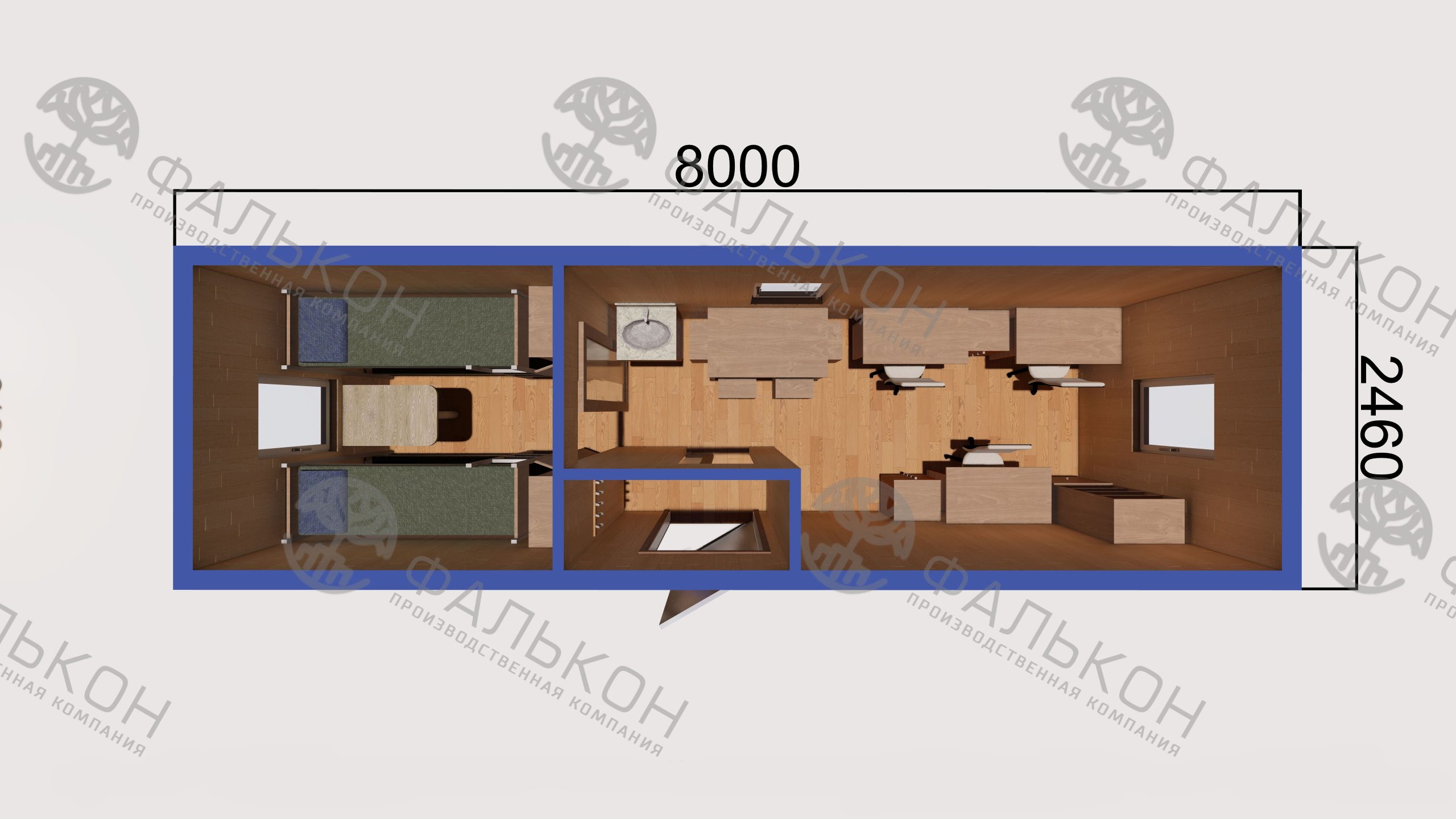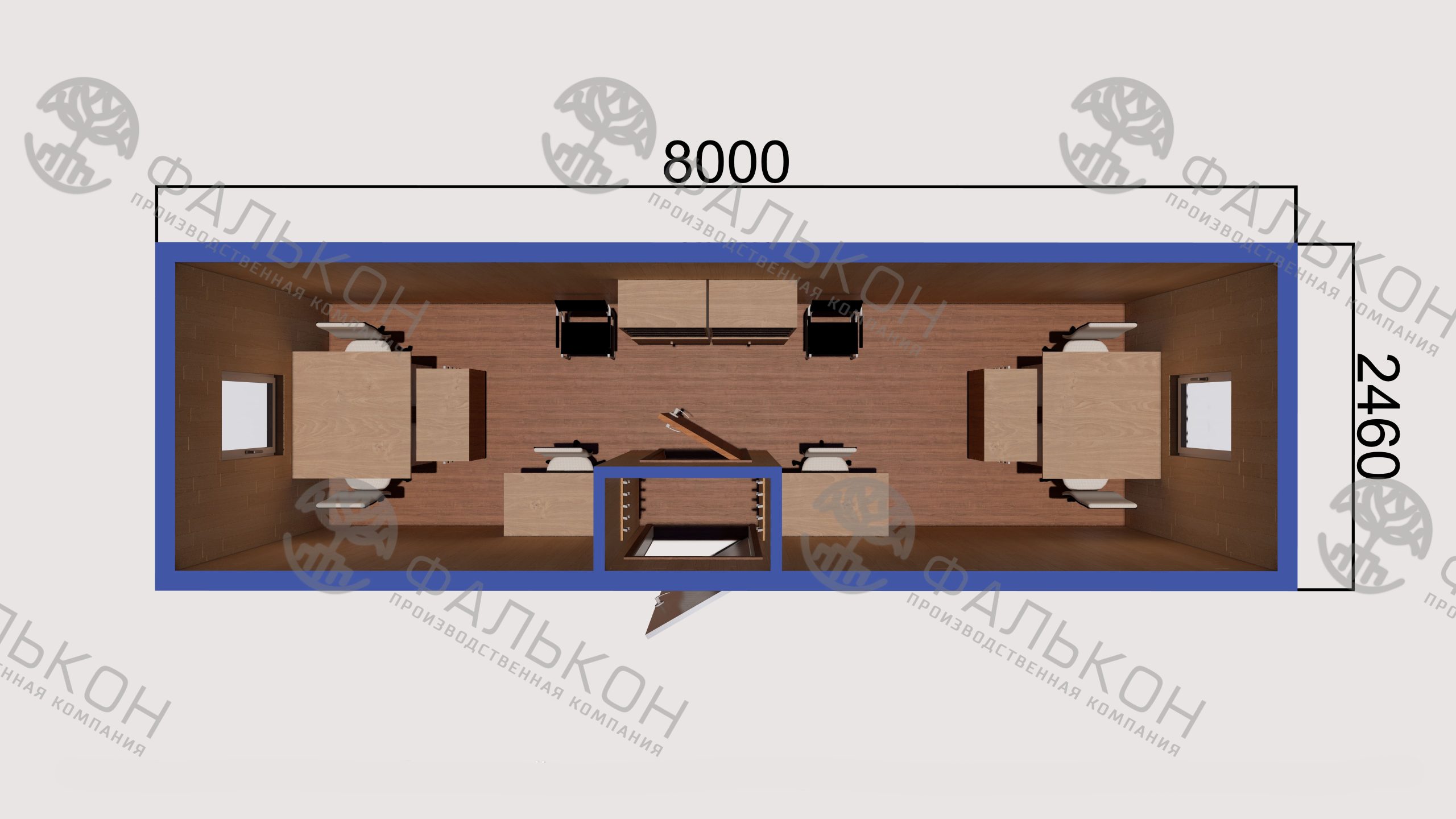 Модульный офис 8060×2460×2775 мм — тёплое здание «под ключ» для быстрого запуска работ. Каркас из стали, утепление 150 мм, фальцевая кровля. Внутри: ЛДСП-стены, потолок профнастил RAL9003, линолеум. Электрика 380 В, освещение уличное + внутреннее, 4 конвектора отопления, вытяжной вентилятор. Вход ДП1-60, 4 окна с москитными сетками. Доставка по Восточной Сибири и Дальнему Востоку.