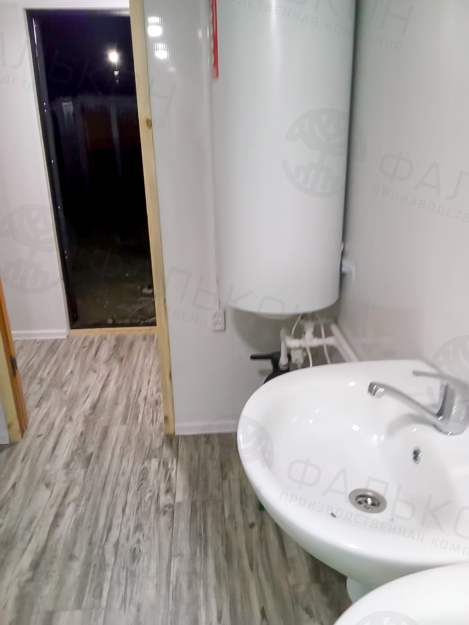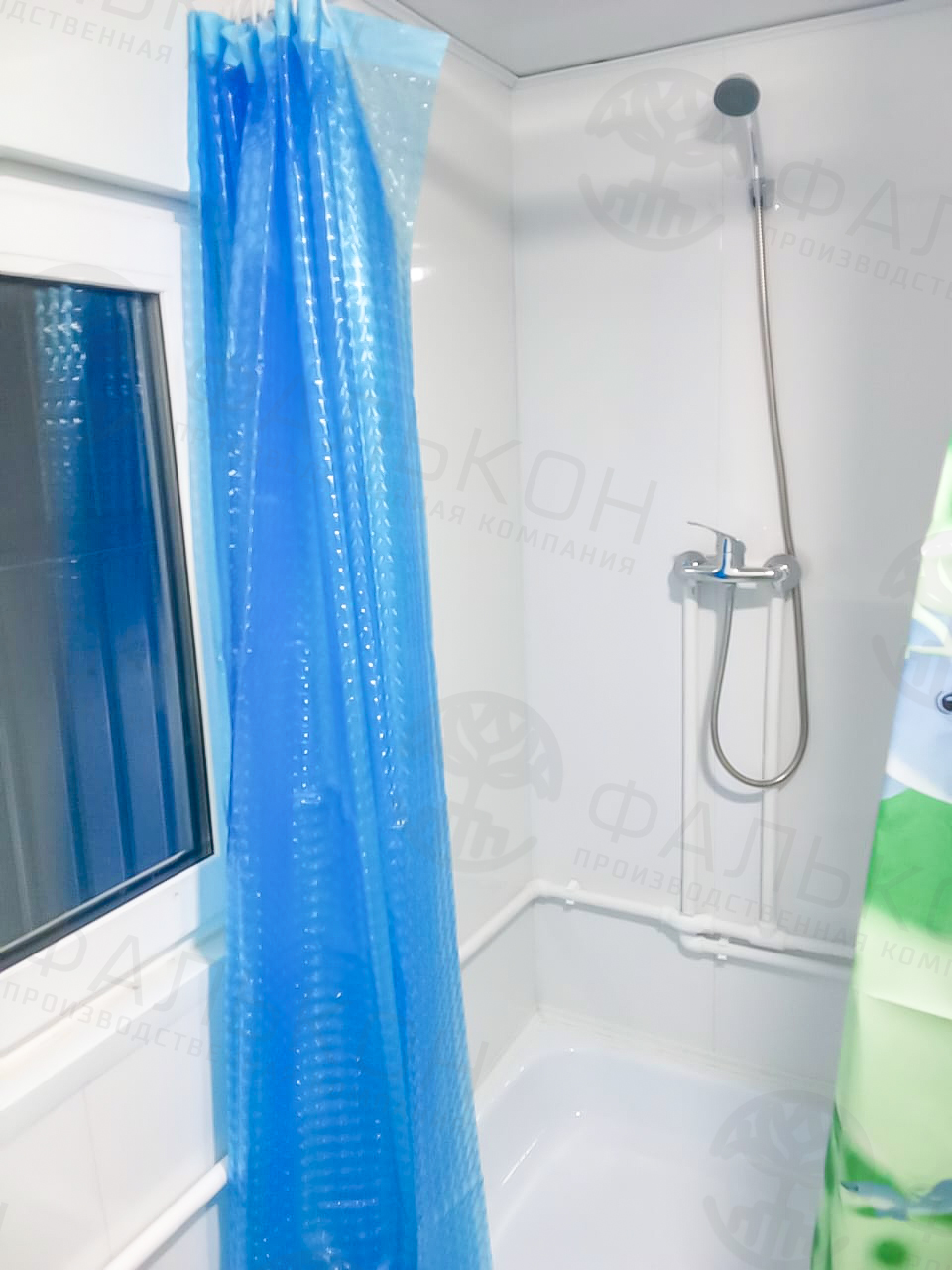 Душевой модуль 8060×2460 мм на раме — готовое решение для вахтов и стройплощадок. Внутри: **4 душевых поста** с поддонами 800×800, смесители и шторки; **бак 1500 л**, насосная станция, **бойлер 150 л**. Электрика **380 В**: щит, уличный и внутренние светильники, **6 розеток**, прокладка в кабель-каналах. Отопление: **2 конвектора** + **тепловая завеса 3 кВт**. Вентиляция: вытяжной вентилятор и приточный анемостат. Отделка: пол — линолеум ПВХ, стены — ЛДСП, потолок — профнастил RAL 9003, перегородки — ЛДСП/МДФ. Двери: входная **ДП1-60** и внутренняя; окно ПВХ с москитной сеткой. Мебель: **2 скамьи** и **2 вешалки**. Подключение к канализации/септику, возможна доставка и шеф-монтаж.